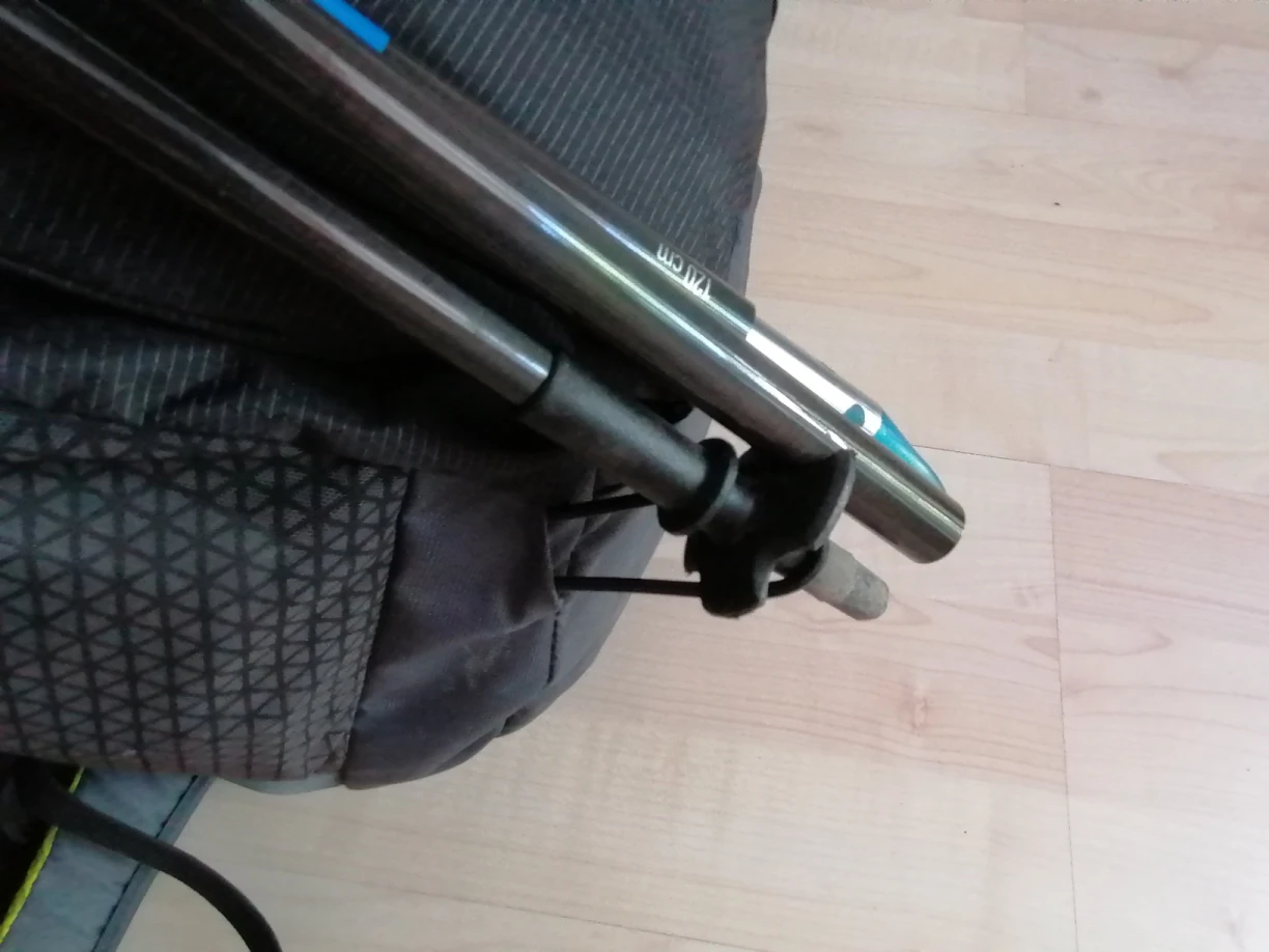 | Compartiments & fixations | 2 compartiments latéraux en mesh, porte-piolet/bâton |